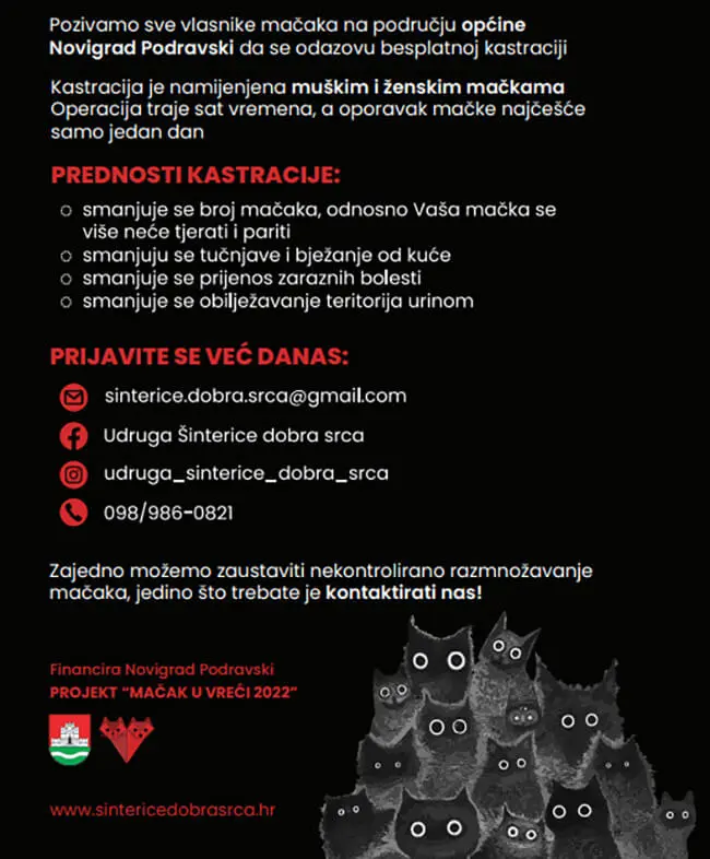 Pozivamo sve vlasnike mačaka na području općine Novigrad Podravski da se odazovu besplatnoj kastraciji. Kastracija je namijenjena muškim i ženskim mačkama. Operacija traje sat vremena, a oporavak mačke najčešće samo jedan dan.